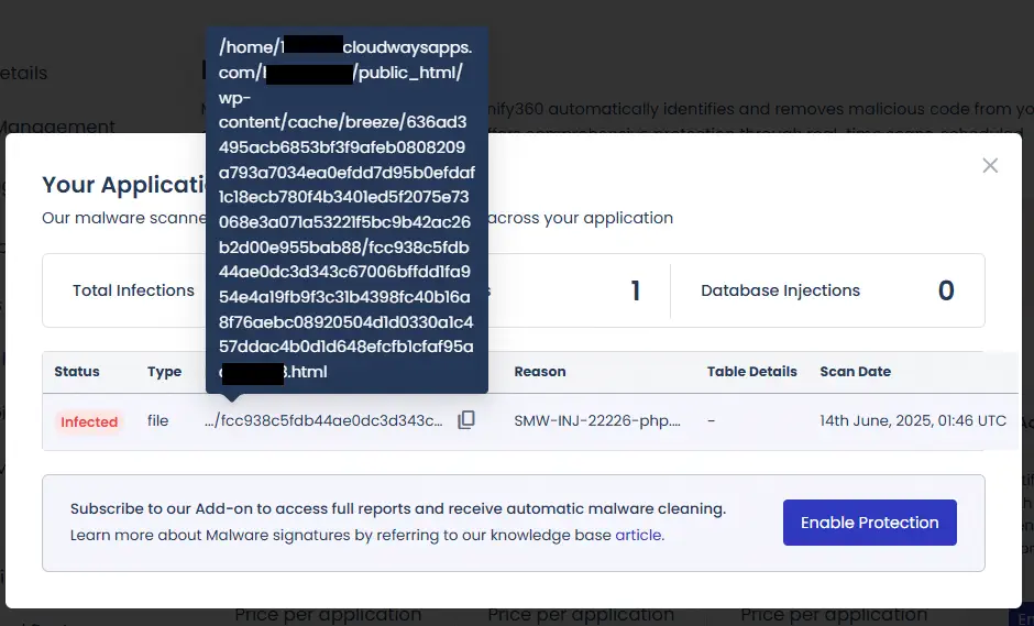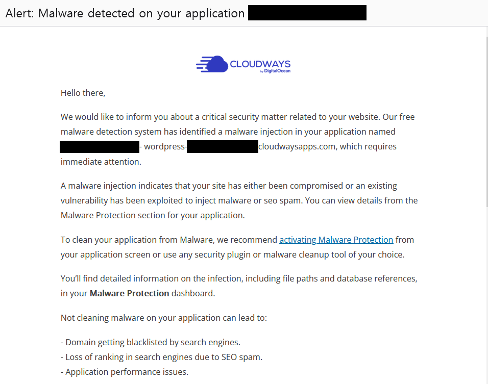 클라우드웨이즈(Cloudways)는 워드프레스 같은 웹 애플리케이션에서 악성코드가 탐지되면 자동으로 “Alert: Malware detected on your application…”라는 제목의 이메일을 발송합니다.