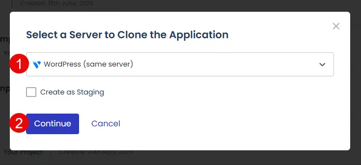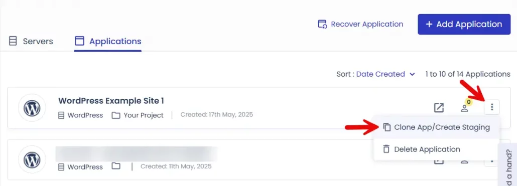 복제할 애플리케이션의 맨 오른쪽에 있는 세 개 점(⋮) 아이콘을 클릭하고 "Clone App/Create Staging" 옵션을 선택합니다. 클론(복제)은 동일한 서버 또는 다른 서버에도 생성할 수 있습니다. 또는, 새 서버를 생성하여 새 서버에 할당할 수도 있습니다.
